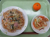 五目あんかけそば・ジャガイモのハニーサラダ・冷とうミカン・牛乳
