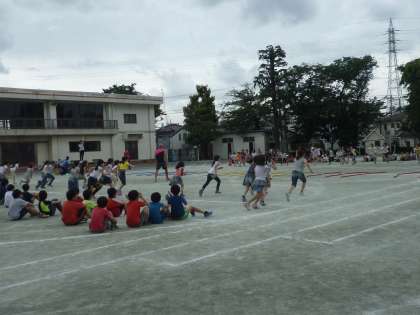 並べた短い綱を赤と白で取り合います。たくさんの綱を自分の陣地に持ってきた方が勝ちです。