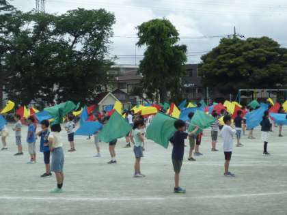 カラフルな旗の動きがそろっている様子は、素晴らしいです。心を一つにして、力強い表現です、。