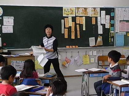 1校時は国語でした。「きつねのおきゃくさま」という物語文の読み取りです。はらぺこきつねが、ひよこから「やさしいお兄ちゃん」といわれ、食べようと思っていたことを躊躇している場面。キーワードになる言葉を文から拾い出しながら、そのときのきつねの気持ち、ひよこの気持ちを一生懸命考えて意見を述べていました。きつねがどう思っているかの吹き出しを考えて発表している様子が真剣で、かわいらしかったです。