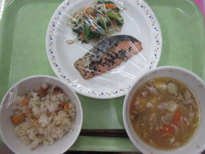 今日は、虫歯予防デーです。よくかむことができる大豆、じゃこ、サツマイモをあげて、あまからくしたものをごはんに混ぜました。