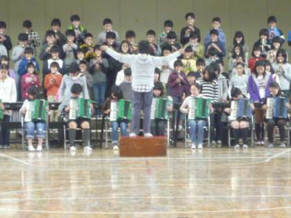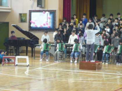 各学年の出し物の後、全校合唱「スマイルアゲイン」を音楽クラブの演奏で気持ちを込めて歌い上げました。そのあと、6年生からのお礼の出し物がありました。6年生の演奏2曲は、会場をシーンとさせるくらい迫力のある演奏で指揮者もとてもかっこよく決めて、たくさんの拍手がわきました。