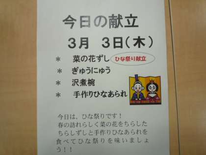 今日はひな祭りなので、給食も栄養士さんと調理員さんたちががんばって、「ひな祭り」献立でした。菜の花ずしが、彩りもよく、とてもおいしかったです。そして、何と、手作りの本当においしいひなあられも出て、ひな祭りを演出してくれました。全部おいしかったです。