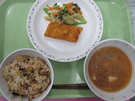 ぶたのかくにごはん・いかのレモンじょうゆ・ごまあえ・みそしる・牛乳