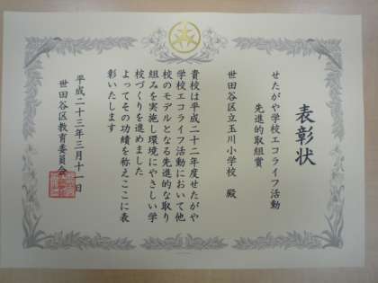 玉川小学校の環境委員会が中心になって今年取り組んできた「エコ アクション5」運動などが、世田谷教育委員会から認められ、写真のような表彰状をいただきました。今日の全校朝会で、環境委員会の委員長に代表で受け取ってもらいました。