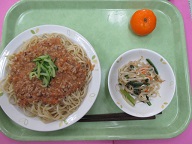ジャージャーめん・塩ナムル・冷とうみかん・牛乳