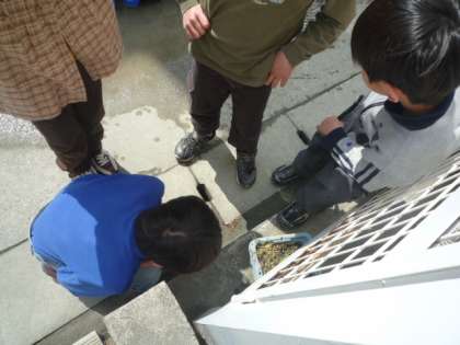 1年生の女の子が、校長室前の犬走りで「校長先生、クモがいます」と棒で突っつきながら話しかけてきました。ちょっと大きめのクモですが、女の子は興味があるらしく、棒の上に乗せようとしたりしながら、「足が10本ある!」と発見しました。「10本もある?」と聞くと、また棒に乗せて、目の近くまで持ってきて数え始めて、「ほら、校長先生も数えて見て」と言うので、数えてみると、確かに10本あるように見えます。そこに、3年生のお兄さんたちが来たので「クモって、足何本?」って聞くと、「昆虫は6本、虫は8本。クモの口の近くのは、足ではなくて触覚だと思います。」と答えてくれました。3年生、すごい。なるほどと思いましたが、1年生の子には、「図鑑で調べてみようね。」と言って別れました。