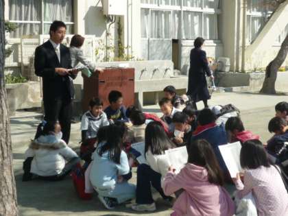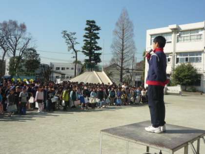 始業式では、新6年生が、去年の6年生のように責任ある仕事をしたいと決意を述べてくれました。学級担任の発表では、子どもたちの歓声が校庭にこだましていました。最後に校歌を音楽クラブの人たちが立派に演奏してくれました。その後、校庭で担任を囲んで簡単な学級指導をして解散しました。