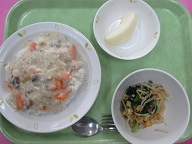 ドリア風・青菜とベーコンのサラダ・りんご・牛乳