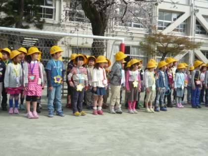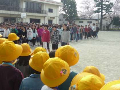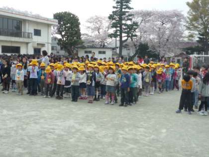 1年生が並んだあと、6年生の代表3人が歓迎の言葉を述べてくれました。とても立派な態度と言葉で、さすがに6年生の気合いは違うなと思いました。それを受けて、かわいい1年生の代表の人たちが、よろしくお願います」と元気にあいさつしていました。1年生が初めて全校朝会の隊列にならんで、今年の玉川小はスタートです。