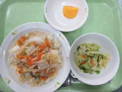 五目あんかけチャーハン・ちゅうかサラダ・柿・牛乳