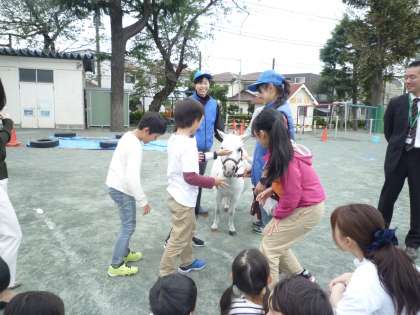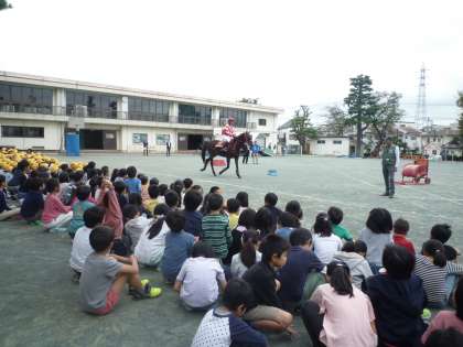 JRAのご協力により玉川小学校に馬が来ました。大きな馬が2頭、小さい馬が2頭。かっこよく走る姿を見せていただいたり、ふれあう機会もあったりとすてきな時間になりました。校庭を馬が走る光景、目に焼き付けました。