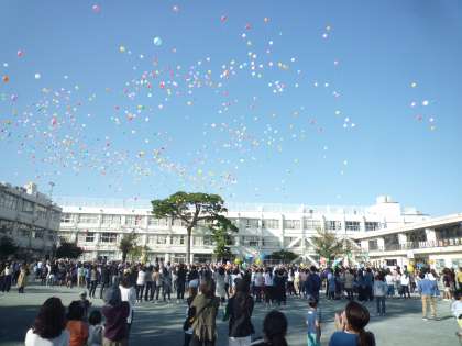 晴天もとで、記念集会が行われました。子どもたちの夢をのせて1000個の風船が飛んでいきました。子どもたち、保護者、教職員、地域のみなさんで素敵な時間を共有しました。