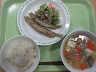ごまごはん・ししゃものからあげ・やさいのゆかりあえ・豚汁・牛乳
