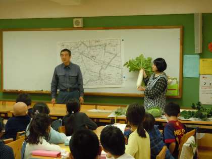 今日は 3年生が ランチルームで粕谷農園の伝法谷さんのお話を伺いました。
