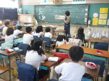 玉川小では、毎週火曜日と金曜日の2回、朝8時35分から50分までの15分間を朝読書の時間と位置づけ、子どもたちの読書活動を習慣化しようとしています。この15分間の時間を使って、本校の保護者やOBで構成する「おはなしバスケット」というボランティア団体が、年間を通じて1年から6年の各学級で読み聞かせ活動を行ってくれています。子どもたちもおはなしバスケットの読み聞かせが定着し、とても楽しみにしてくれています。読み聞かせが上手なので、子どもたちがすぐに物語の世界に引き込まれて、朝のすがすがしい雰囲気を作ってくれています。