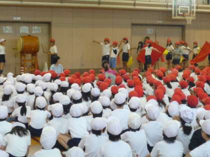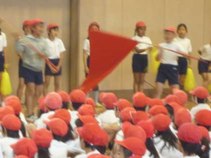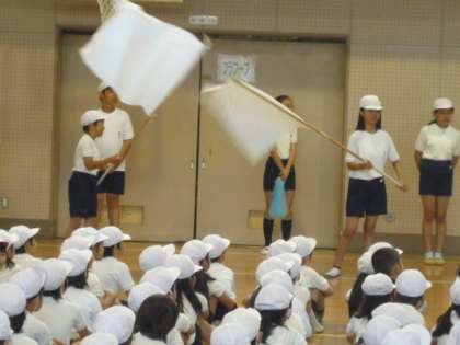 朝からの雨のために、運動会の全校練習が、急きょ体育館で行われました。今日は、開閉会式の練習を中心に行われました。応援団長が優勝旗・準優勝杯を受け取る練習や、応援の練習を行いました。