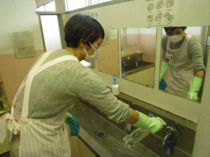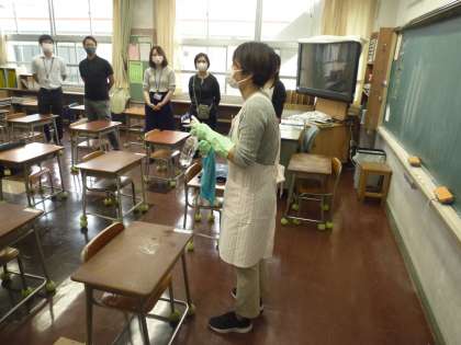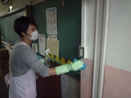 子どもたちは帰った後、ガイドラインに従って教室やドア、手洗い場、トイレなどを消毒する方法について全教職員で研修を行いました。大切な玉川の子どもたちの健康安全を守りたいという思いが伝わってきます。毎日、消毒を行います。
