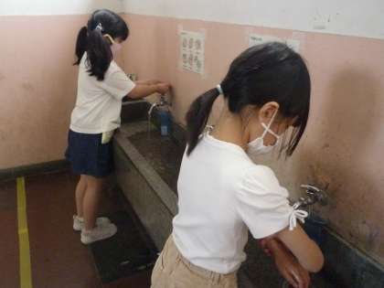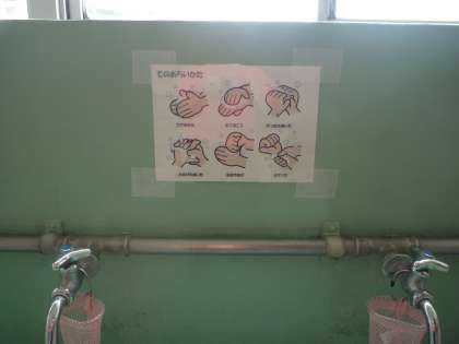 登校時や休み時間などに手洗いしています。水道の壁には、手洗いの仕方を掲示しました。上手に手を洗っています。