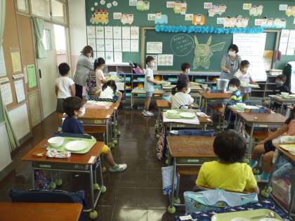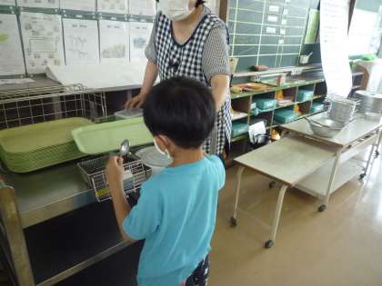 来週から始まる給食に向けて、準備や片付けの練習を始めました。食器やおぼんをそっと持って運びます。1年生、緊張している様子でした。