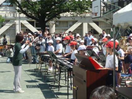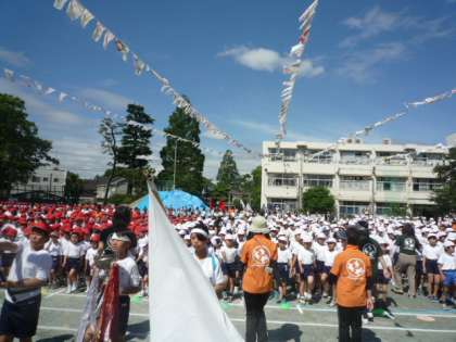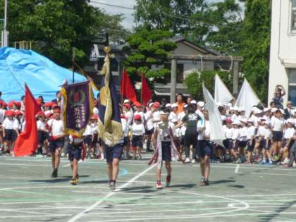 音楽クラブのすばらしい演奏に合わせて、校旗・優勝旗・準優勝旗・応援団旗の入場を皮切りに、各学年が立派に入場して、運動会の開会式が始まりました。
