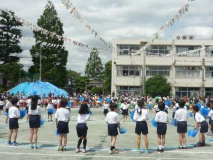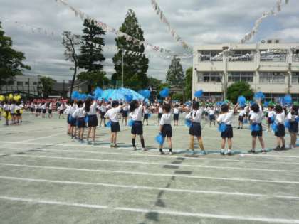3年生の徒競争が始まる前、審判係の5,6年生が真剣にその準備をして備えていました。また、そのあとの1年生の表現「ベストウィッシュ」は、赤、青、緑、黄色のテープの色が鮮やかで、子どもたちの表情も楽しそうに、ポケモンの音楽に合わせて踊っていました。