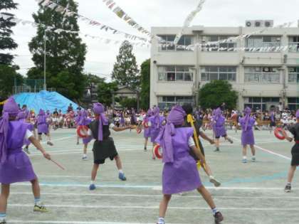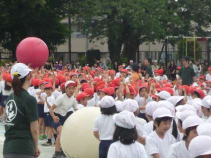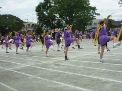4年生の表現「なんくるエイサー」は、見事に沖縄の雰囲気を衣装で醸し出しながら、子どもたちのそろった踊りと叩く太鼓の音がとてもすてきでした。そして、午前の部の最終種目「大玉送り」で、子どもたちが午前中で最高に盛り上がった時間でした。