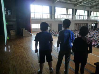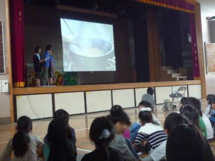 今日の児童集会で、給食委員会が、給食ができるまでの様子をビデオを使って紹介してくれました。野菜の皮をむく機械やキャベツを千切りにする機械、大量の玉ねぎを調理師さんたちが全員で千切りにしている様子、9個の大型炊飯器でご飯ができる様子など、珍しい場面の紹介がありました。子どもたちは食い入るように見ながら、あれって、今日の給食ですか?と聴いてくる子もいるくらい真剣でした。最後に、残菜がたくさん残るので、各学級でしっかり完食できるようにがんばりましょうと委員の子どもたちが話していました。