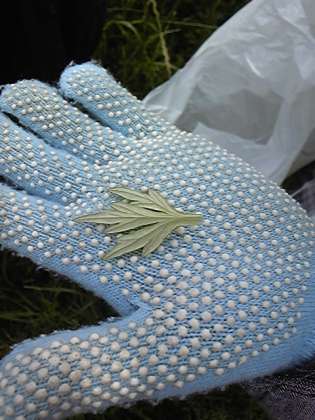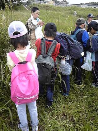 多摩川の土手で、班ごとにヨモギを摘みました。おいしいお団子になりますように!