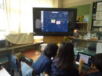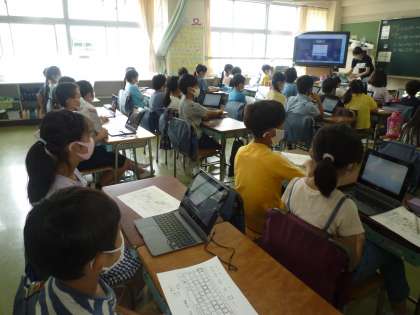 3年生がロイロノートの授業をしています。夏休みの課題提出ができるようになるためです。学校のネット環境がしっかり整っていないなかですが、先生たちが工夫して行っています。