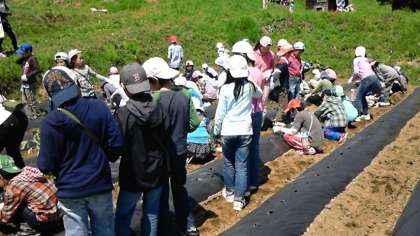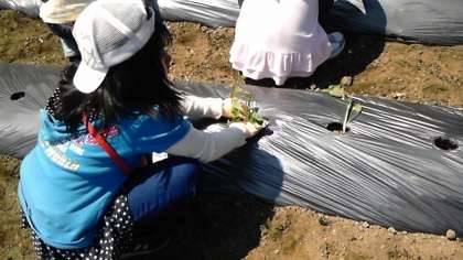 昼食のあと、川場村の畑で、さつまいもの苗植えをしました。一人3本から5本植えました。世田谷の子どもたちにとって、貴重な自然体験です。