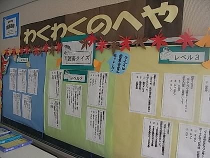 今週と来週は、読書週間です。玉川小では、写真のように、さまざまな催しが行われます。「わくわくのへや」の壁には、図書委員会の子どもたちが案を出し合って作り上げた「読書クイズ」があります。レベル1からレベル3までありますが、レベル1も結構大人にとっては手ごわい問題でした。ぜひ、チャレンジしてみてください。そのほかにも、おはなしバスケットの方々による中休み時間の「お話会」、図書委員会による読み聞かせ集会などなど、催し物満載の2週間です。ぜひ、この2週間で、自分のお気に入りの本を1冊でも多く出会ってほしいと願っています。