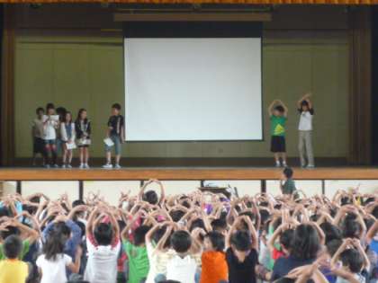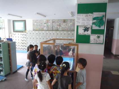 今日の児童集会で、飼育委員会の委員会発表がありました。飼育委員会で世話している「うさぎ」と「かめ」。それに関係するクイズ形式で発表が行われました。アオウミガメの「ゆう」と「かい」について、飼育委員会からお別れ会を行いますと言われて、子どもたちはびっくりした様子でした。ゆうとかいがあまりに大きく成長しすぎて、水槽が狭くなって、ゆうとかいが運動不足になってしまうからです。6月下旬か7月初めには、お別れしなくてはなりません。集会の後、子どもたちが水槽に集まって、ゆうよかいをじっと見ていました。