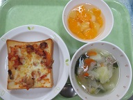 ピザトースト・ベーコンと野菜のスープ・フルーツ白玉・牛乳