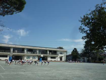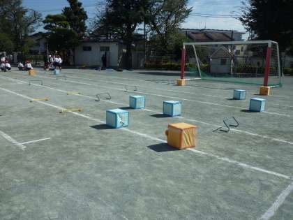 校庭の体育では、係の子どもが中心となり、準備運動をしています。きちんと整列してしっかりできているのはさすが4年生。障害物走も置くものを小さいものから少し大きいものまでさまざま用意し、子どもたちが楽しめるよう工夫しています。
