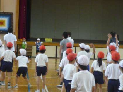 2時間目体育館では、3年3組4組合同でドッジボール大会をしていました。クラス対抗の後に、大人対子どもの試合をして盛り上がっていました。