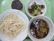 肉うどん(つけ汁)・和風サラダ・チョコレートブラウニー・牛乳