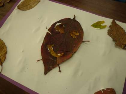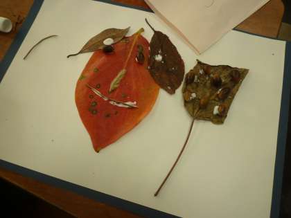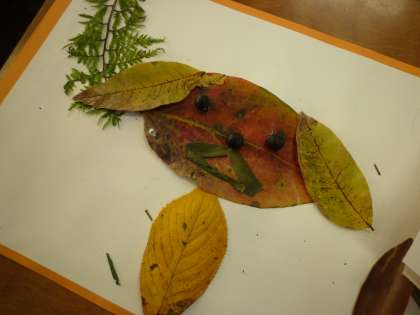 1年生が落ち葉や木の枝などを使って絵をかいています。とても素敵な作品に仕上がっています。