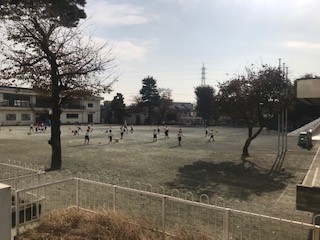 暖かな日が続いています。校庭では1年生が元気に体育です。