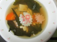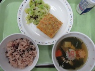 赤飯・松風焼き・キャベツのしおこんぶかけ・お祝いすまし汁・乳酸飲料