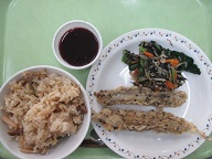 きのこごはん・ししゃもの石垣揚げ・やさいののりあえ・ブドウゼリー・牛乳