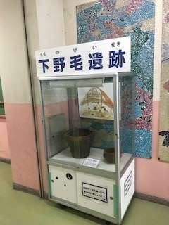 2階渡り廊下に下野毛遺跡の土器などの資料を展示しています。