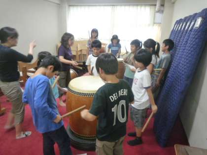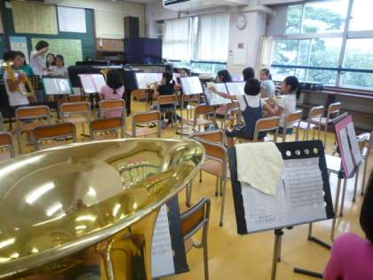 午前中はっきりしない天候でしたが、午後になって雨がやんで元気に子どもたちがクラブ活動をはじめました。職員室に響く太鼓の音につられて音楽室の階段を上っていくと、今年できた和太鼓クラブが叩き方を香月先生に一生懸命教わっていました。隣の音楽室では、金管楽器もとりいれて「ルパン三世のテーマ」をパート練習しているところでした。