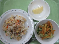 エビチャーハン・かりかり豆のサラダ・りんご・牛乳