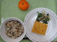 豆とひじきのごはん・千草焼き・ごまあえ・みかん・牛乳