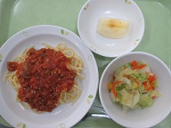 スパゲティミートソース・コーンサラダ・りんご・牛乳