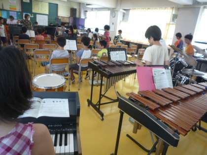 授業の前半は、合唱の練習、後半は、合奏の練習をしていました。合奏では、からだより大きく感じるアコーデオンやけん盤楽器、木琴や鉄琴、太鼓など、さまざまな楽器がいっしょに音をそろえて、メロディを奏でていました。音を合わせる大切さと大変さを感じているような一瞬でした、