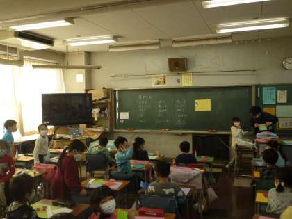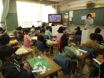 昔遊びですごろくを作っています。カラフルな折り紙を使い、工夫しています。出来上がりが楽しみです。
