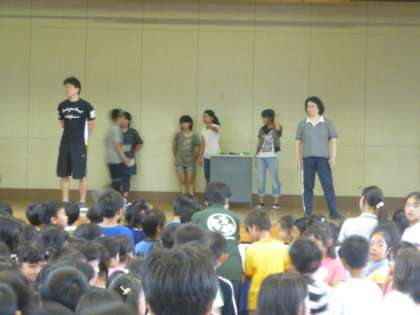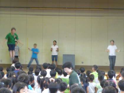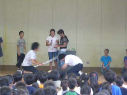 今日の児童集会は、「先生対決!どっちが勝つか」でした。腕相撲対決、二重跳び対決、なぞなぞ対決、ジャンケン対決。写真のような先生方での対決に、どちらが勝つか予想していました。子どもたちは大賑わいで楽しみました。