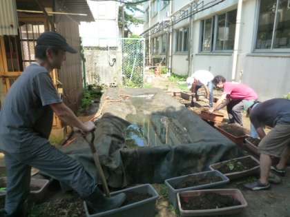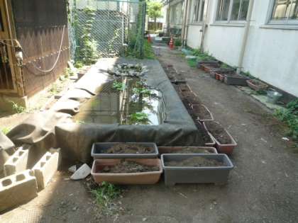 今日の午後、おやじの会の皆さんが集まって、子どもたちが草ぬきした花壇にビニルシートをかぶせて、ビオトープを完成してくれました。そのあと、多摩川にまで出かけて、ビオトープにふさわしい大きさの石も探して入れてくれました。ご協力ありがとうございました。